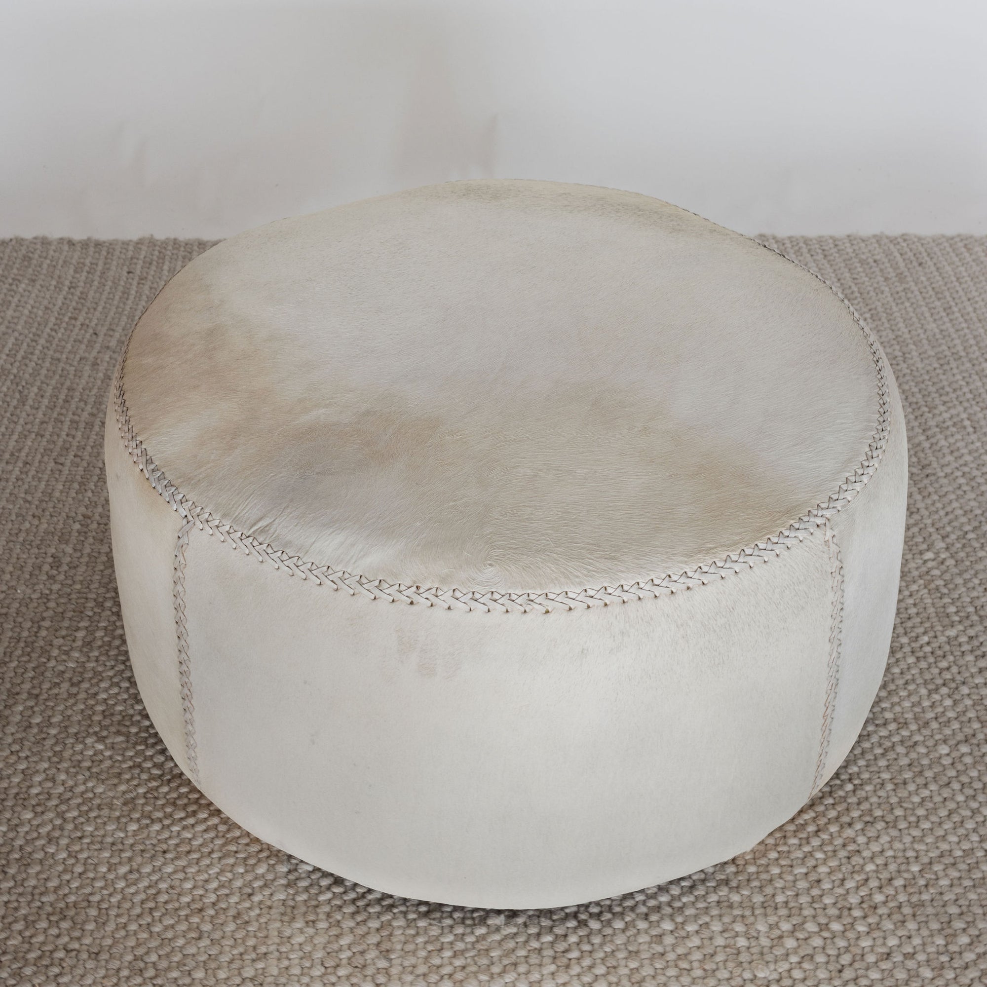 At 80cm diameter this extralarge round cowhide ottoman is designed for larger living spaces. We chose a light colored hide for this particular ottoman, with small touches of earthy caramel as seen on the top and sides of this ottoman. We have taken six photos from all angles to give you a feel for the ottoman from every side.