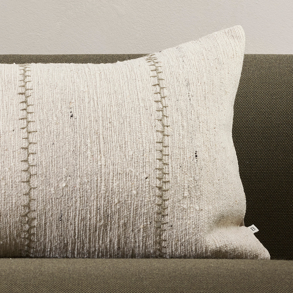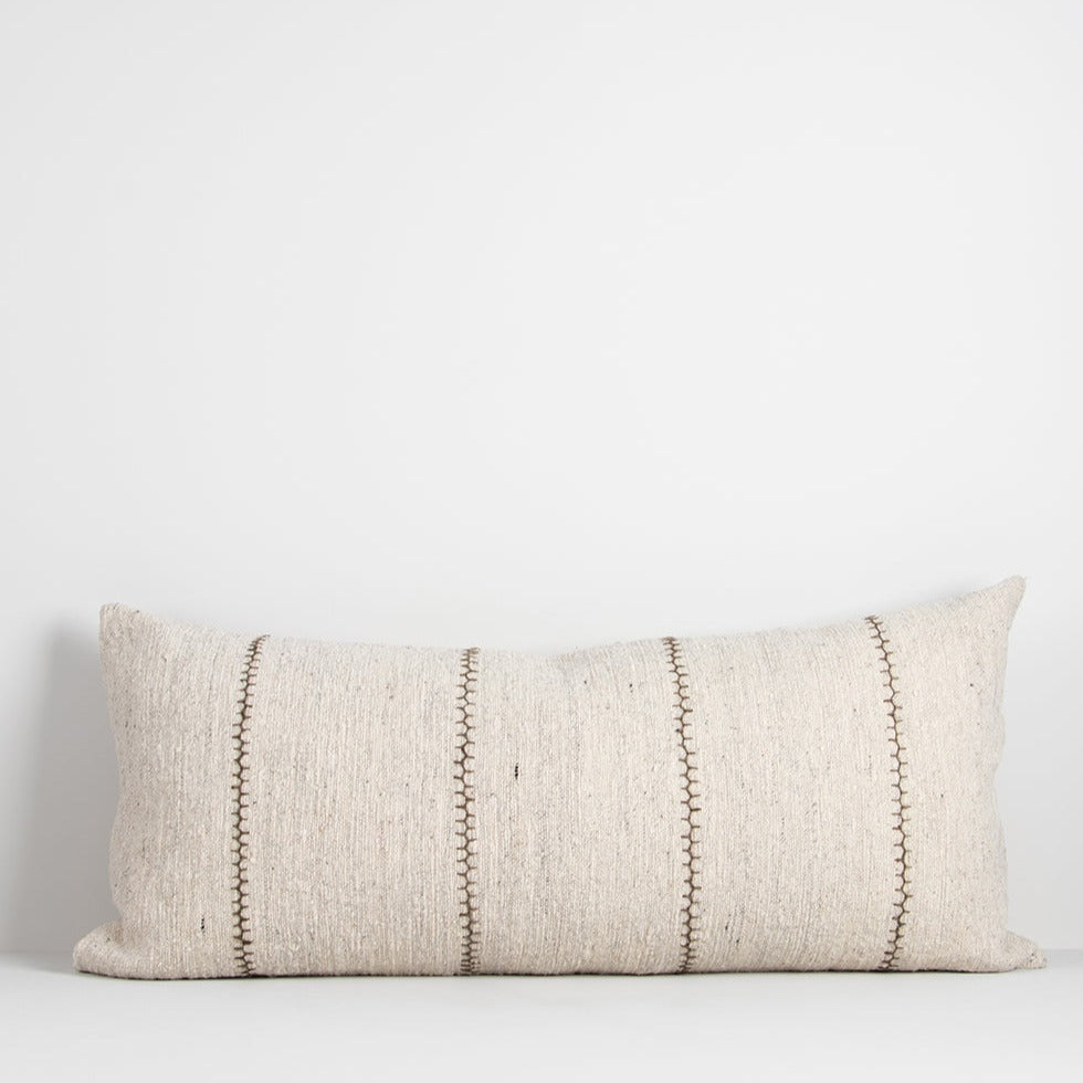 The perfect lumbar cushion to complete your bed setting. This long cushion has been handwoven from thick, textural cotton with hand stitched detailing in vertical lines over the front of the cushion. It comes complete with a soft full feather inner.