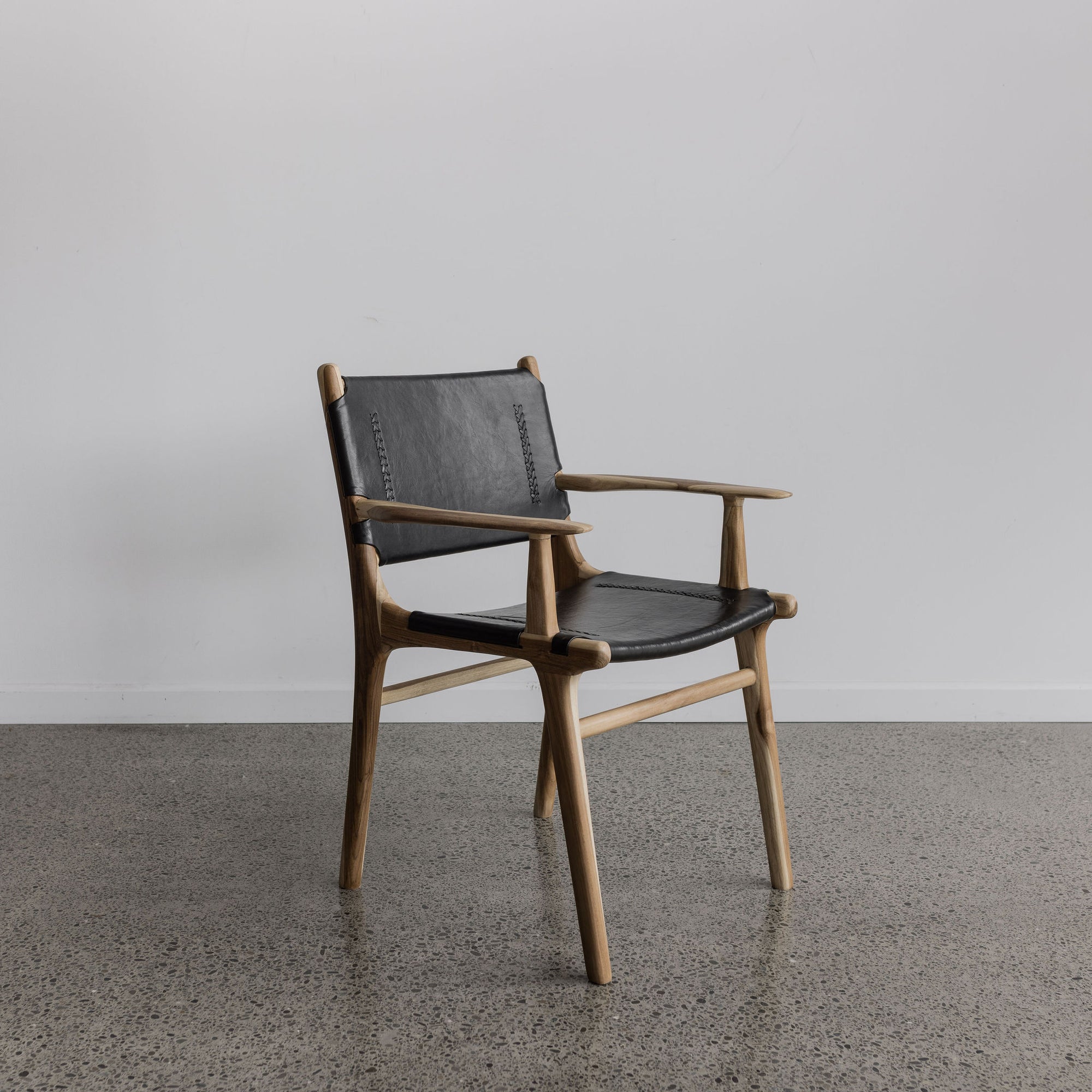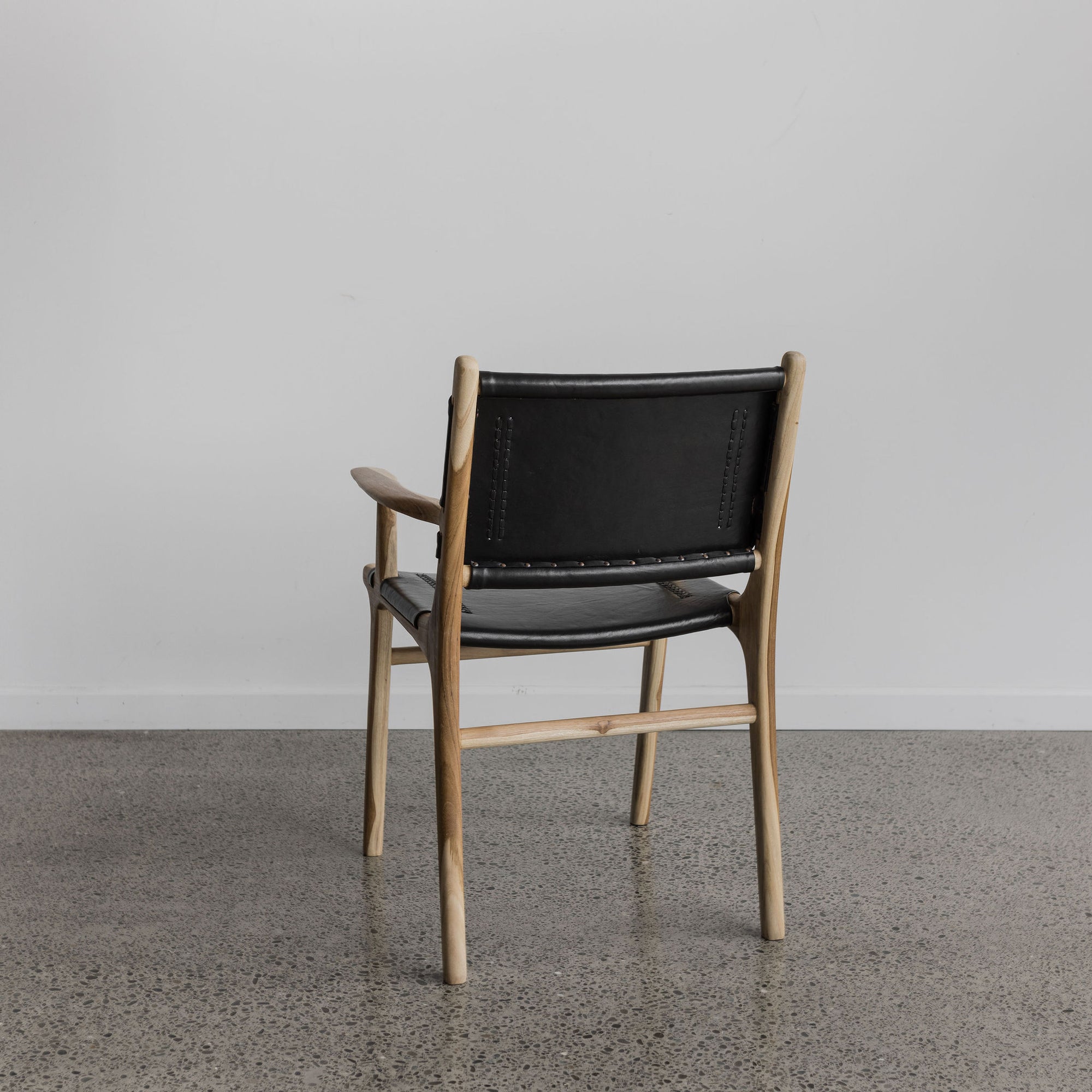 The carver chair, re-defined.  Handmade in our workshop in Indonesia, with the purpose of celebrating the true talent of the craftspeople we work with.  We invite you to take a closer look at the braided leather stitching visible on the leather seat and leather back. A testament to the skills of our Indonesian partners.  The back is also fully covered in leather.