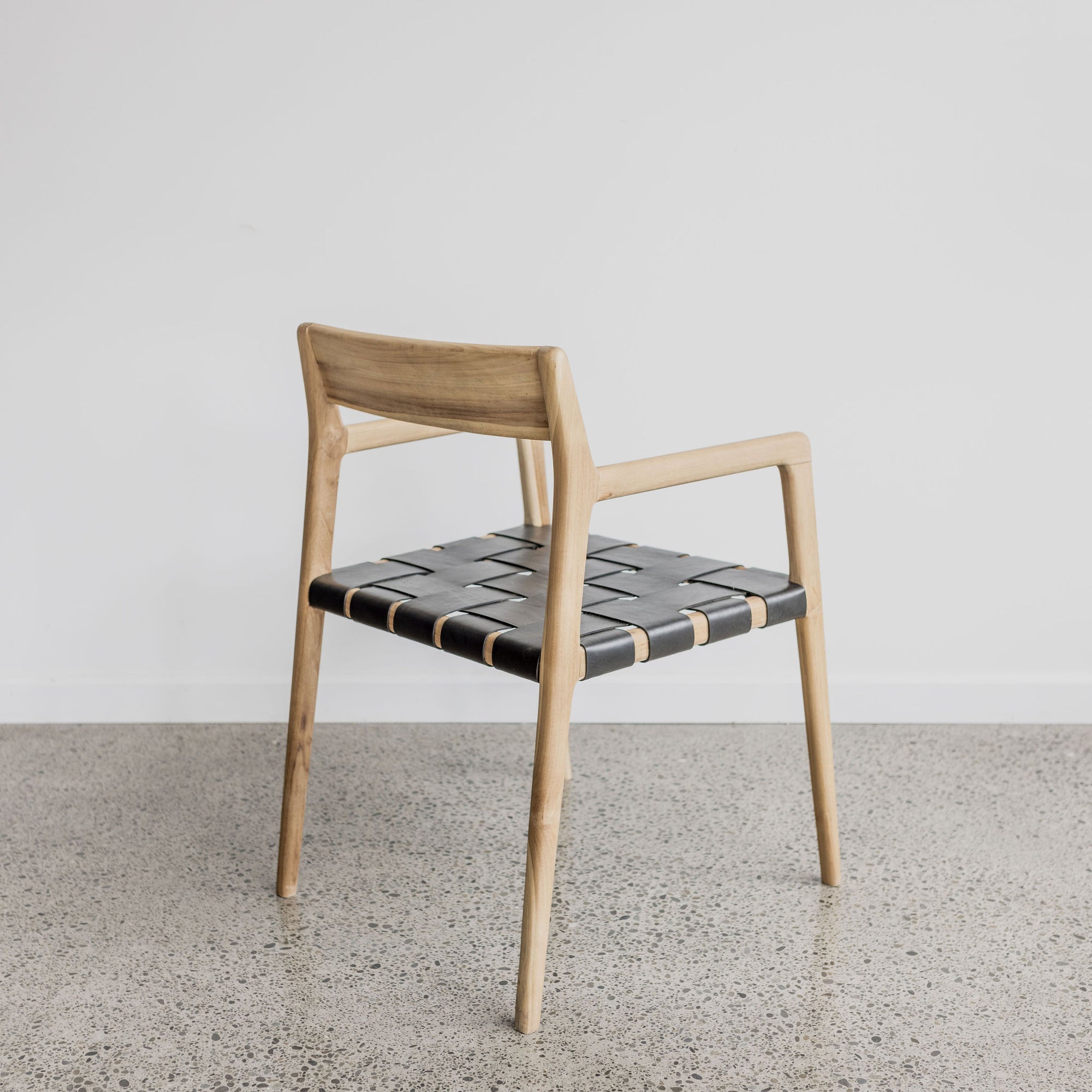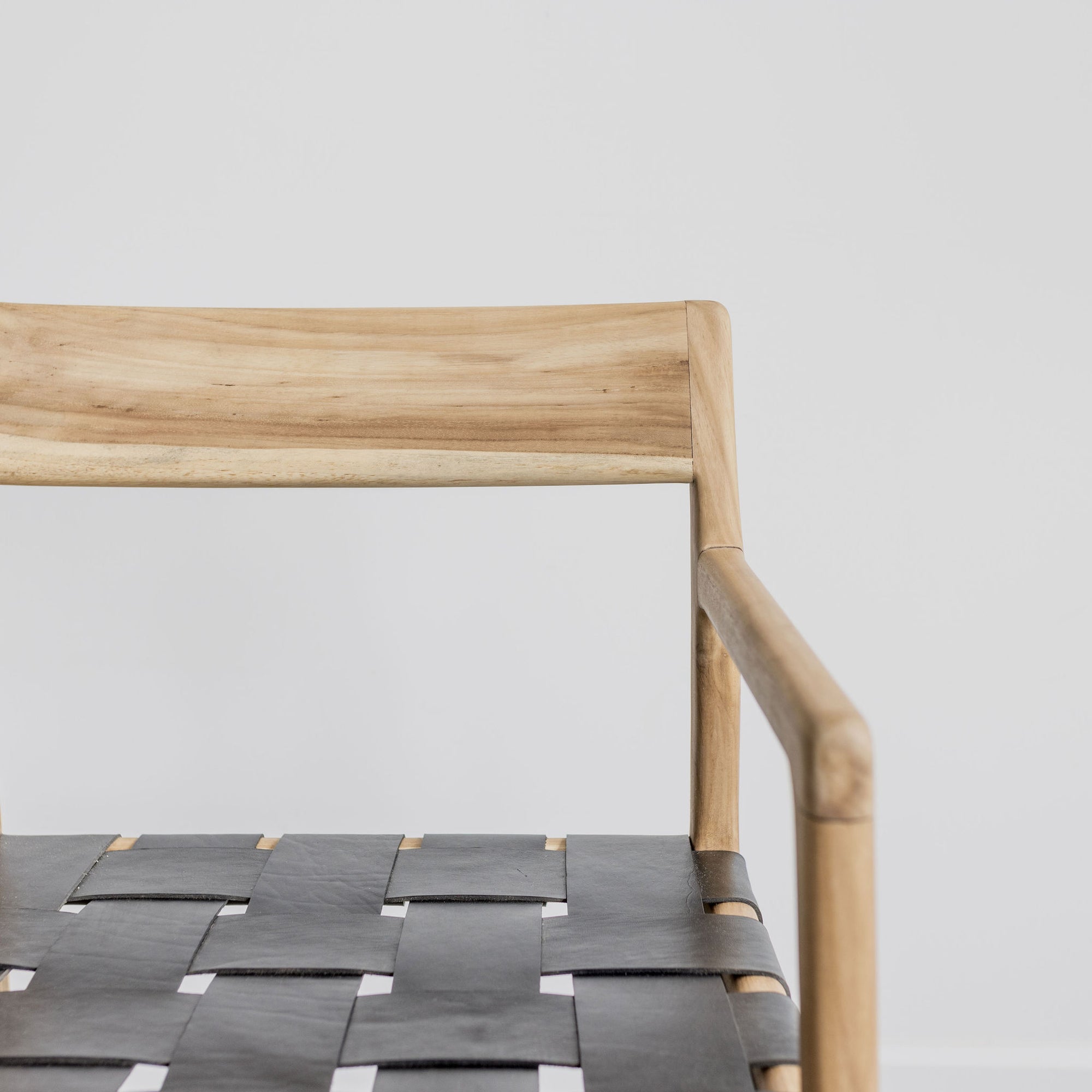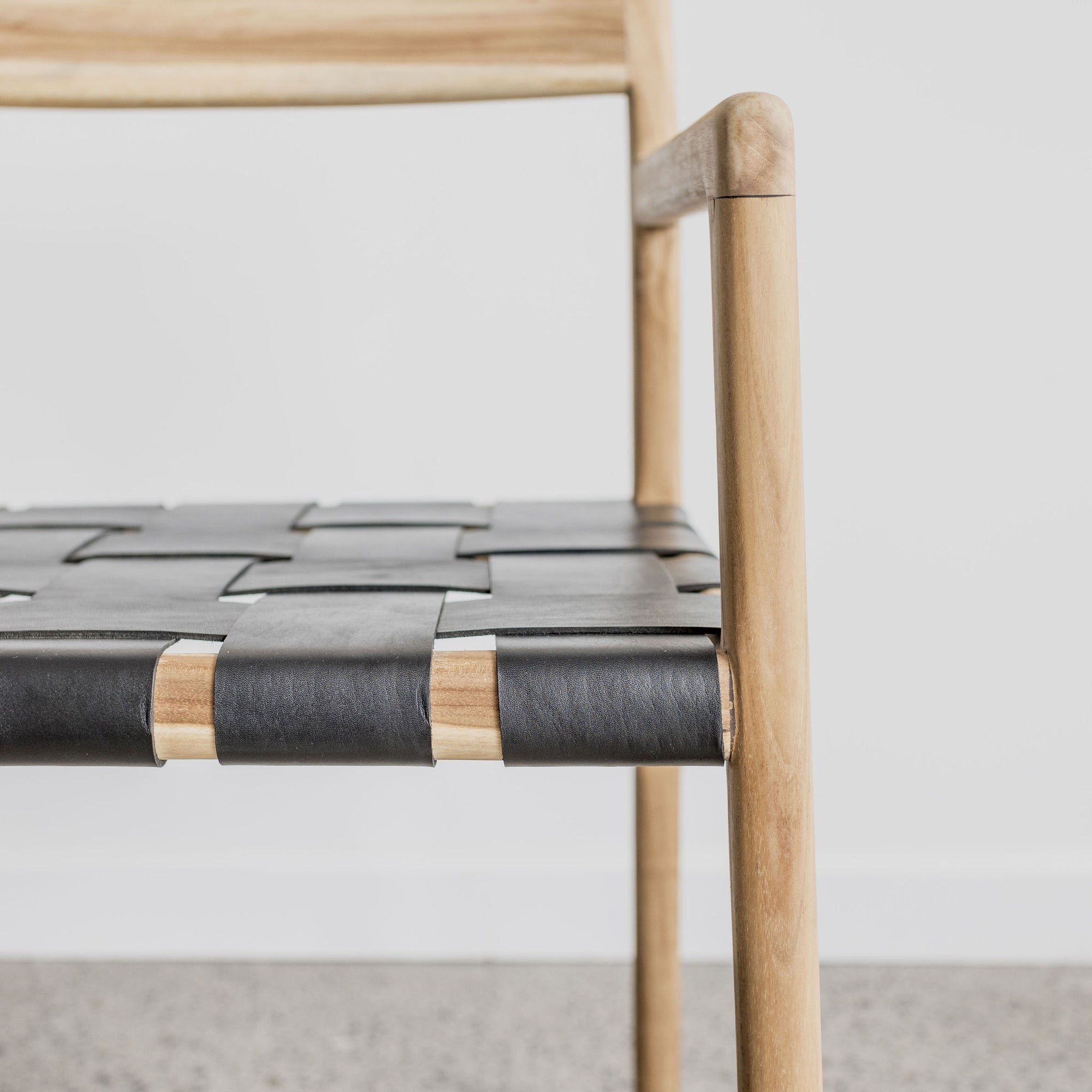 Handmade in our workshop, we choose to celebrate the natural grain of the teak wood, and create a comfortable seat woven with thick pieces of distressed black leather. The wood on each chair is unique, as each tree is.