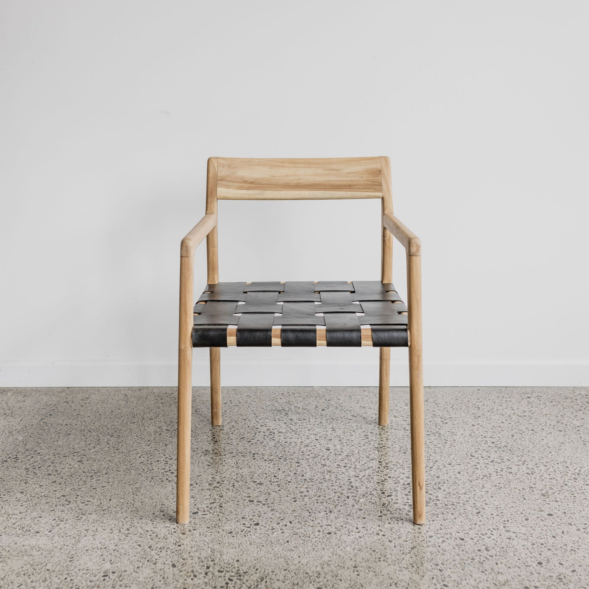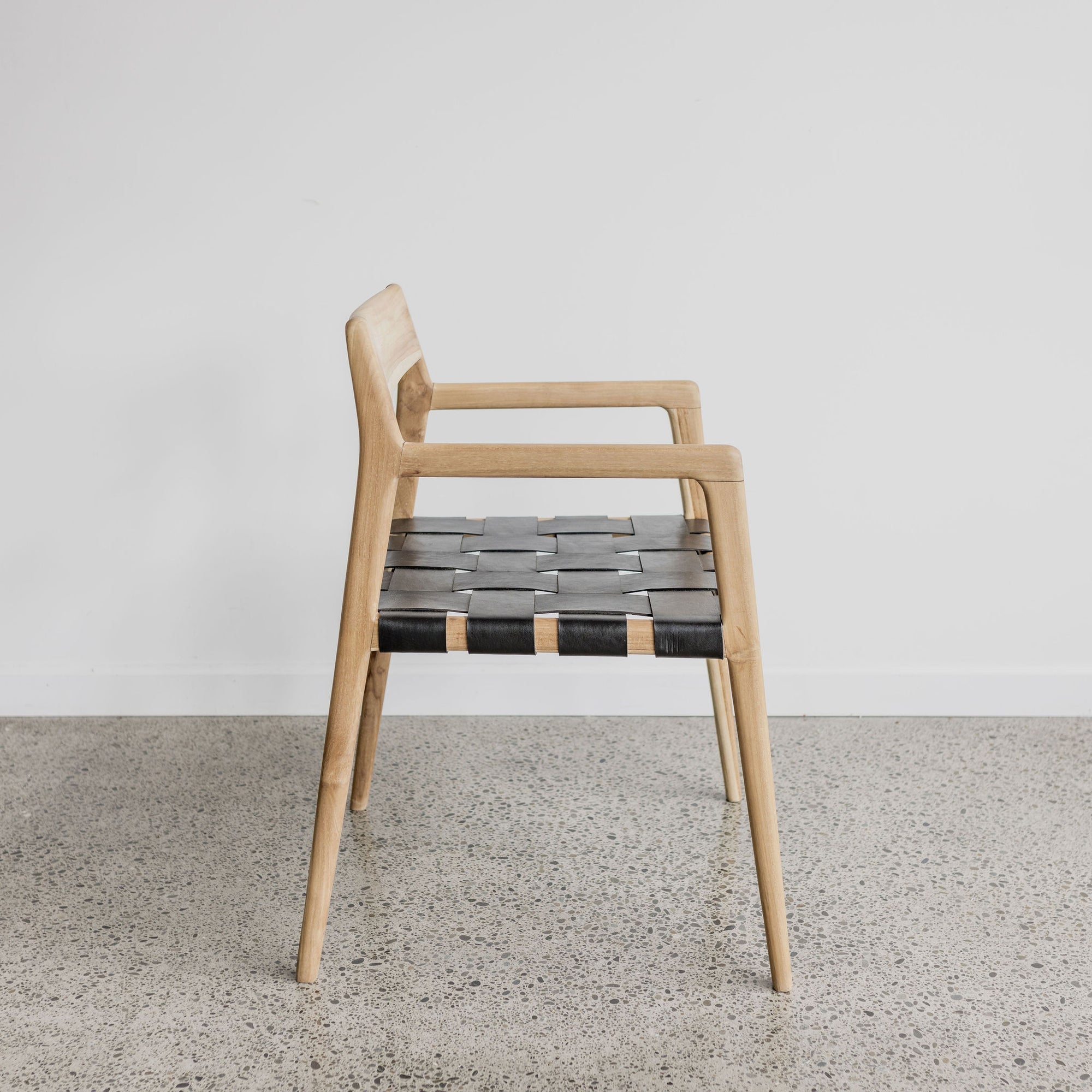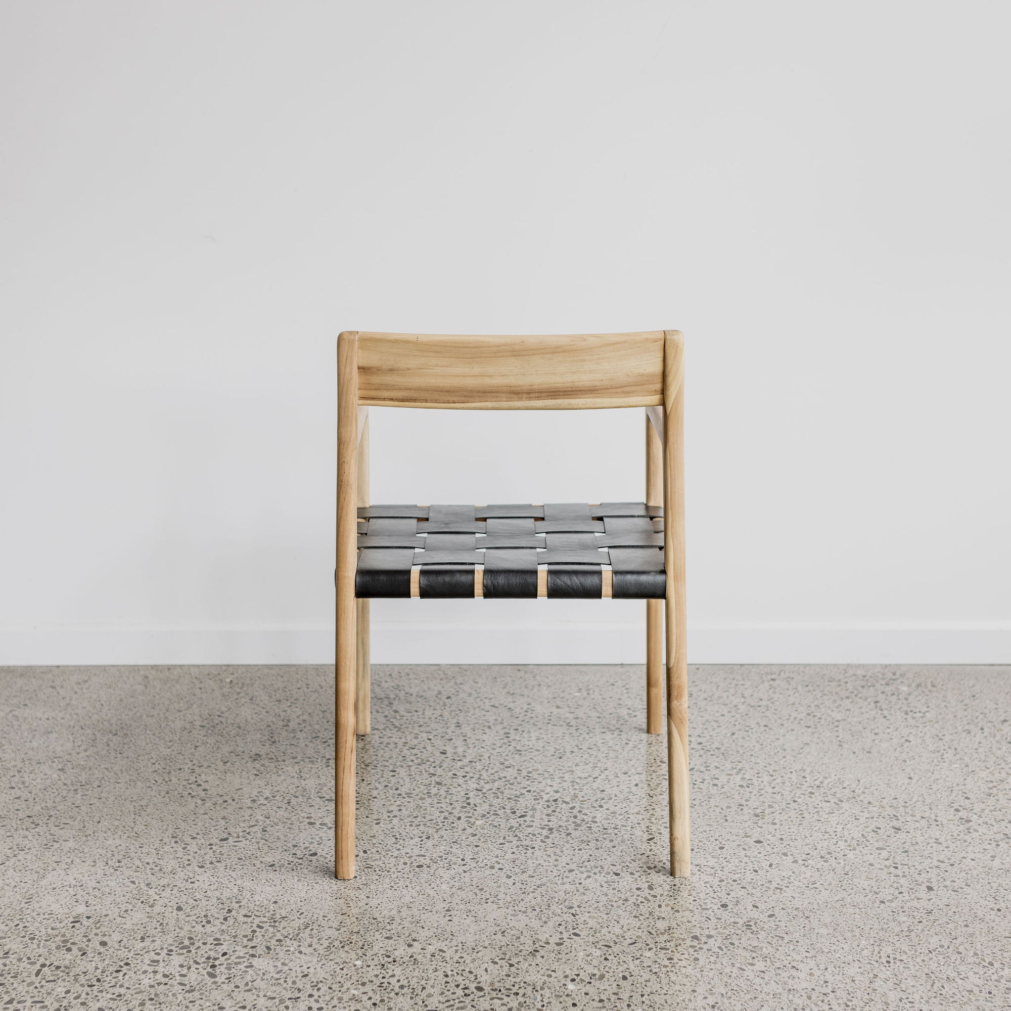 Handmade in our workshop, we choose to celebrate the natural grain of the teak wood, and create a comfortable seat woven with thick pieces of distressed black leather. The wood on each chair is unique, as each tree is.