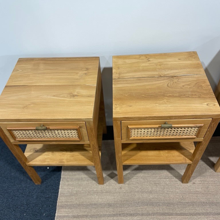 These Corcovado bedside tables have been handmade from sustainably sourced teak wood. They feature a rattan-fronted drawer which adds both practicality and texture to the bedside.