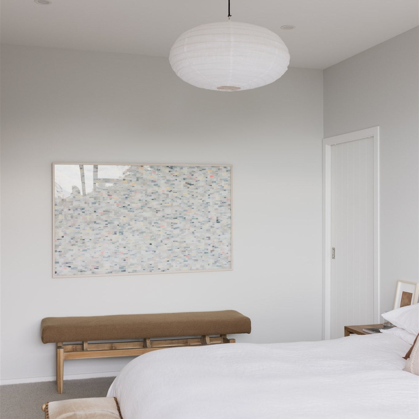 This white oval linen pendant by Corcovado is ideal for rooms with lower ceilings including bedrooms, dining spaces. and hallway spaces. The organic shape and use of natural materials will add a softness and texture to your space.