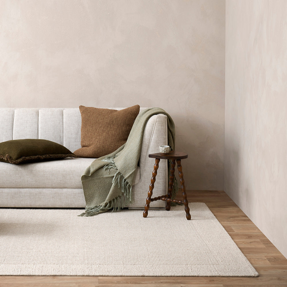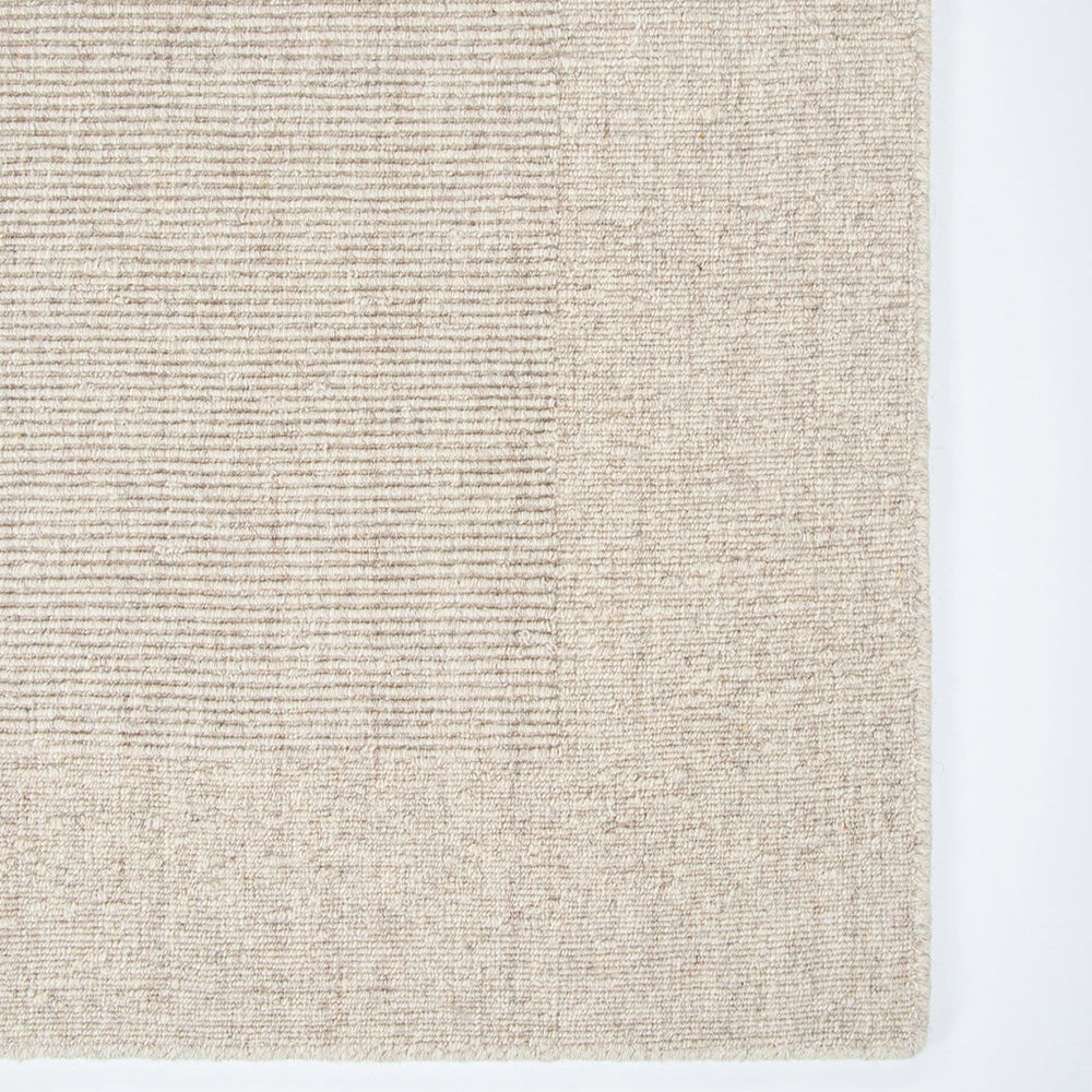 Finished with a subtle border around the sides and ends of the rug, as shown. It also comes in a slightly darker shade called Driftwood.