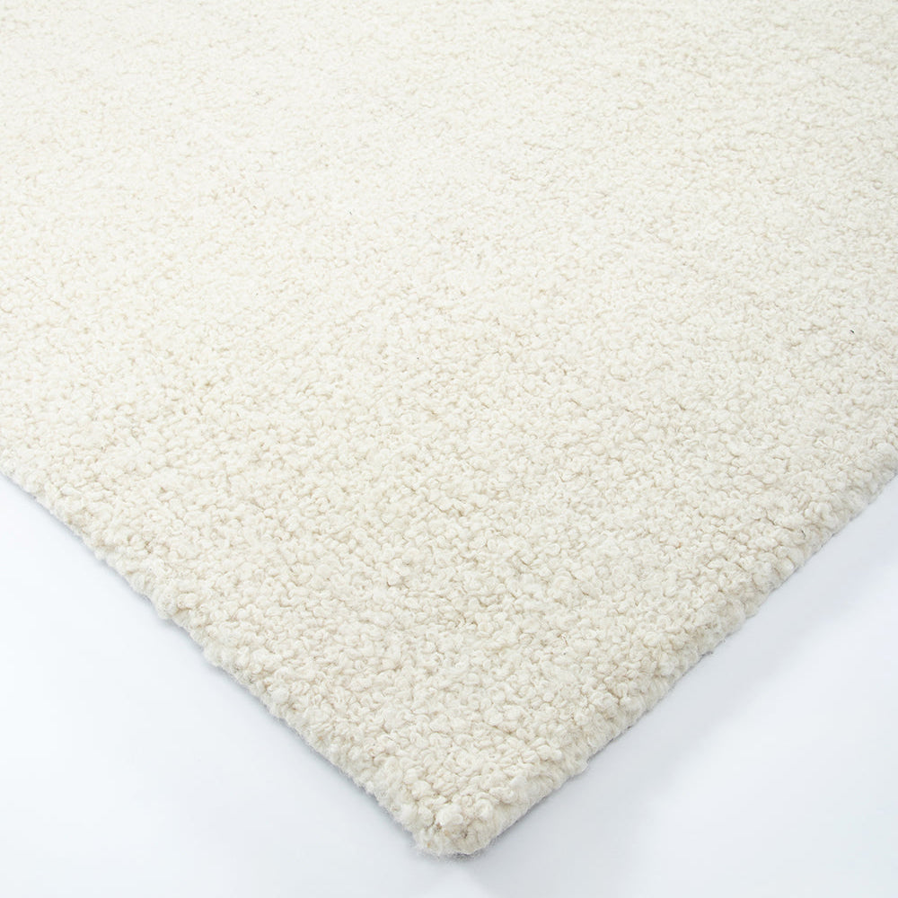 This thick, boucle textured rug is made from 90% New Zealand wool and 10% Merino wool, with cotton backing.