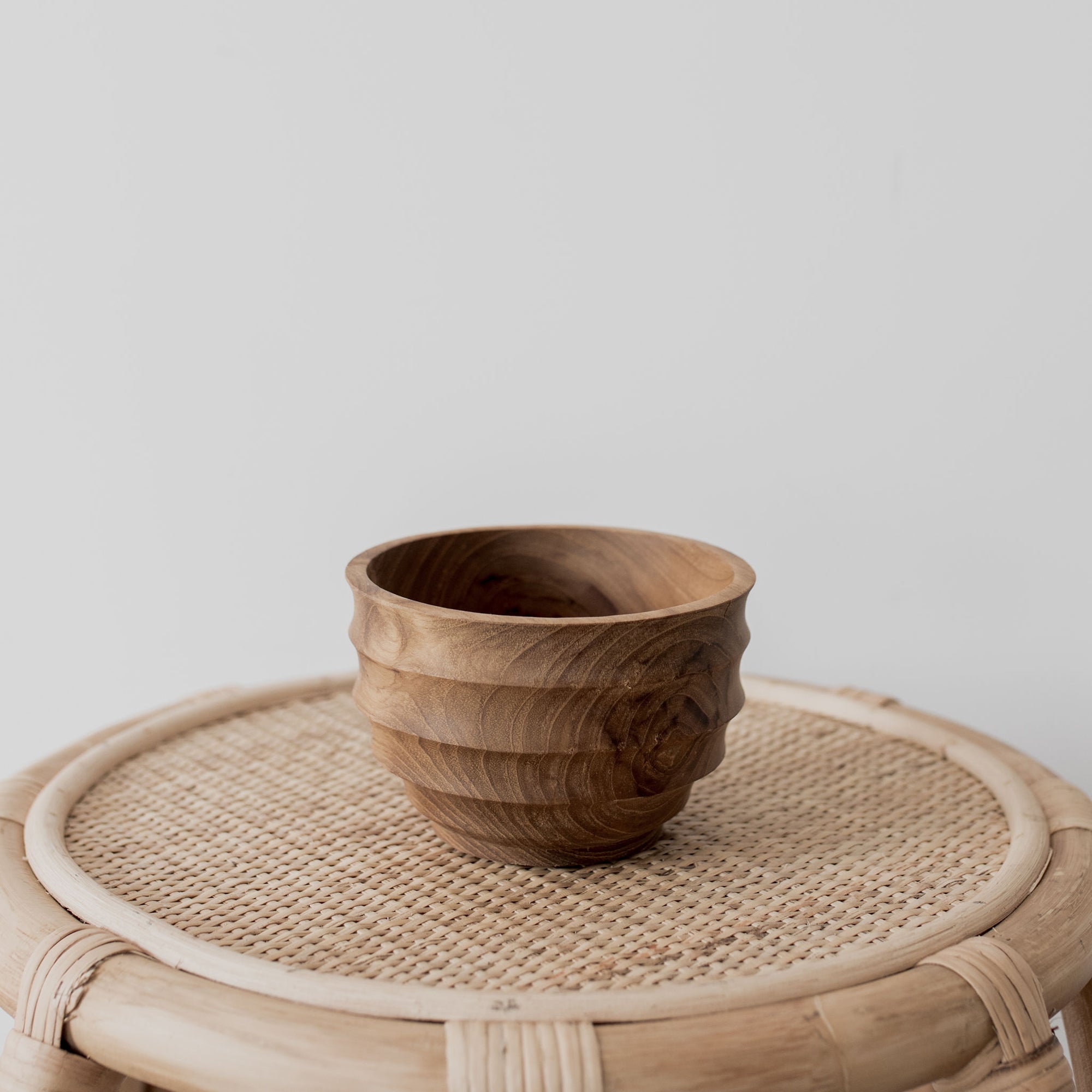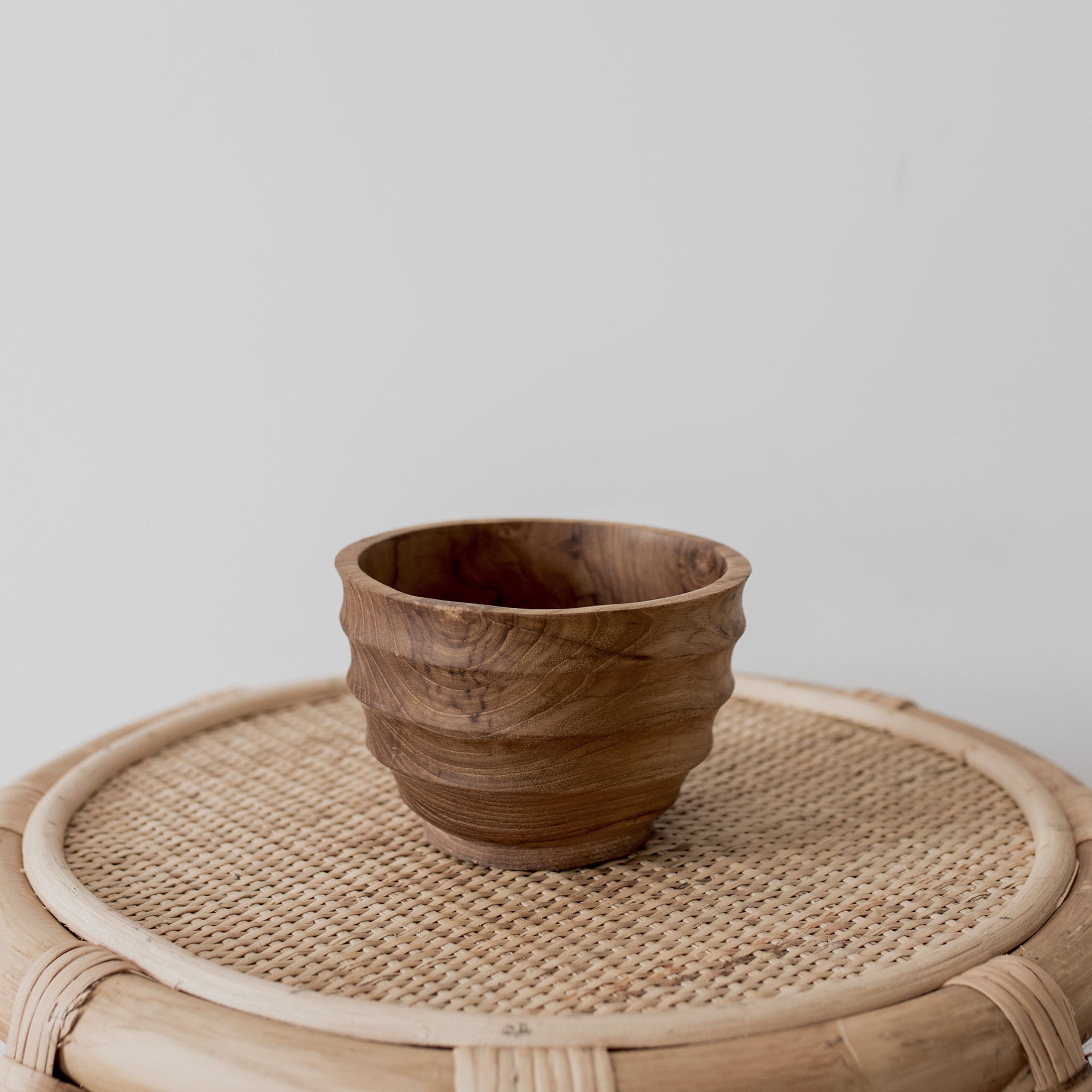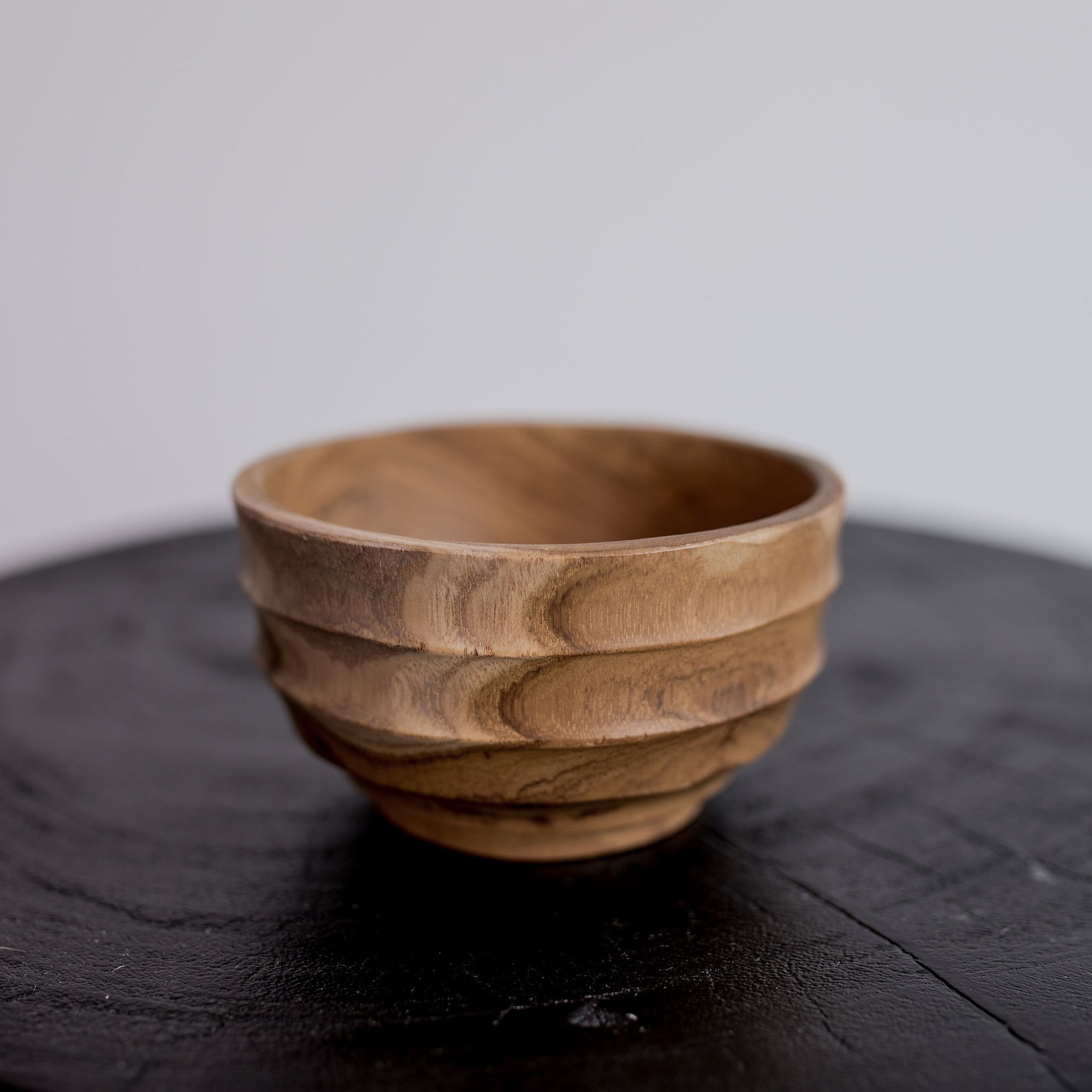 A simple teak wood bowl, with groove detailing on the outside. Perfect for rice, or breakfast foods, or for display atop cabinets or consoles.