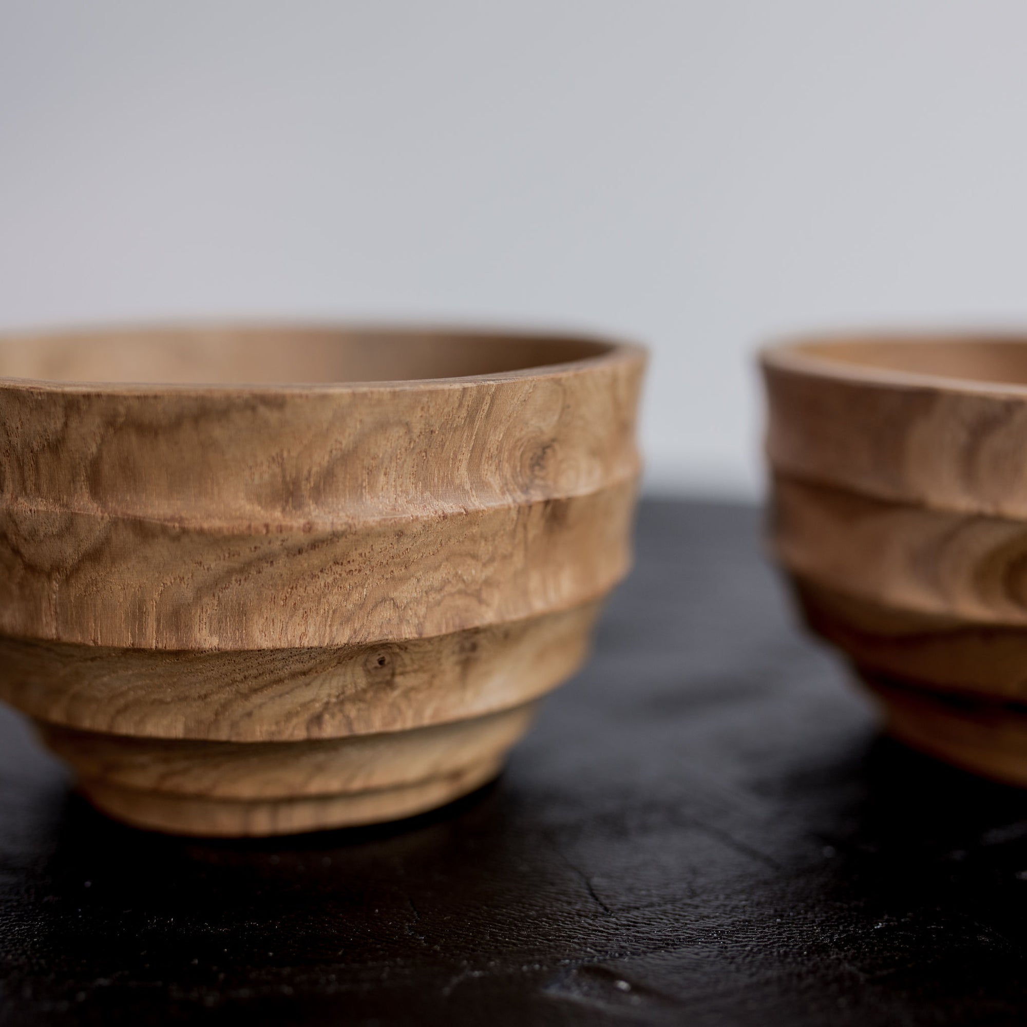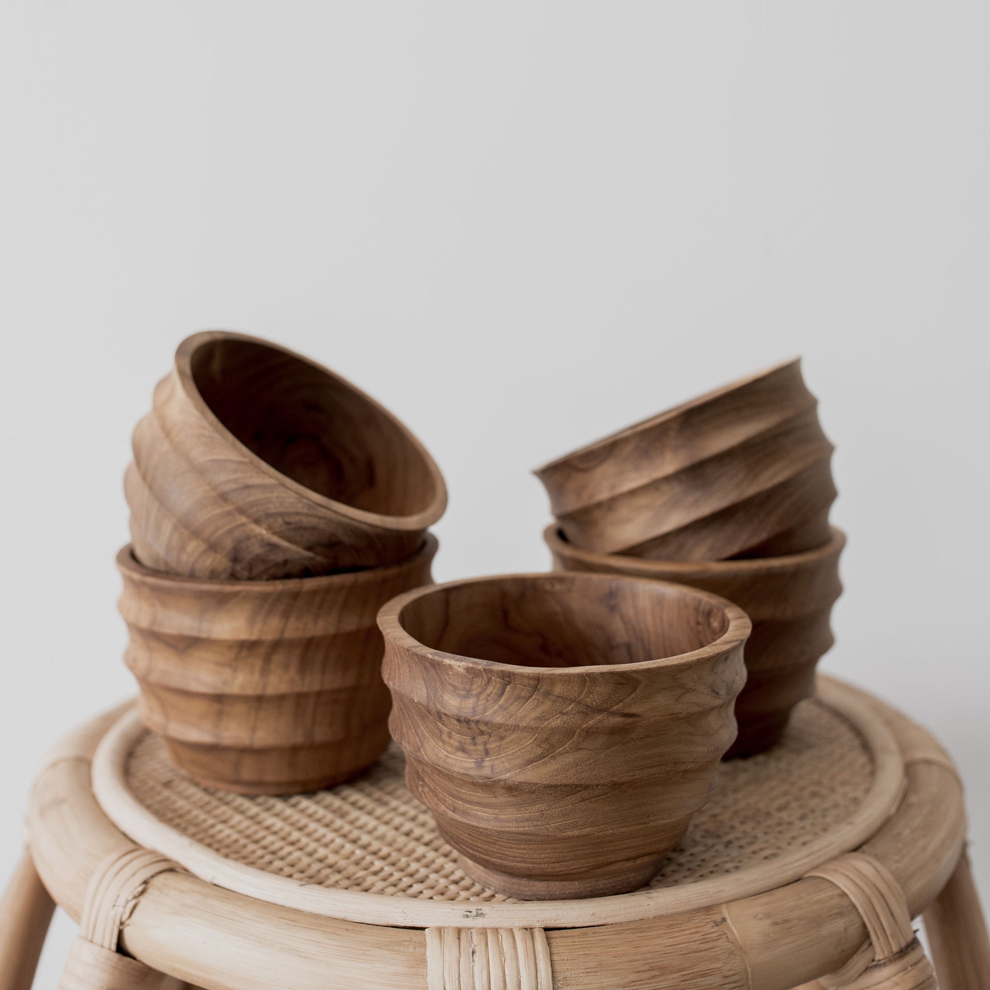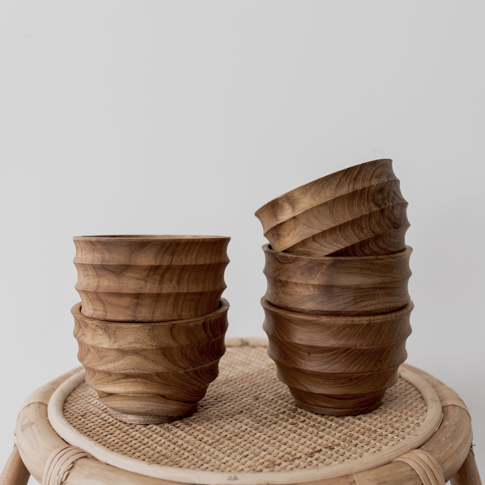 A simple teak wood bowl, with groove detailing on the outside. Perfect for rice, or breakfast foods, or for display atop cabinets or consoles.